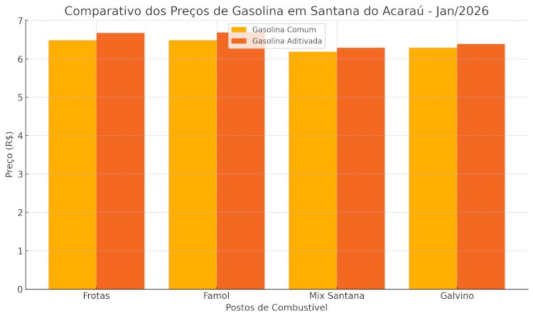 Para facilitar a visualização, confira o gráfico com os preços da gasolina comum e aditivada nos postos de Santana do Acaraú em janeiro de 2026: